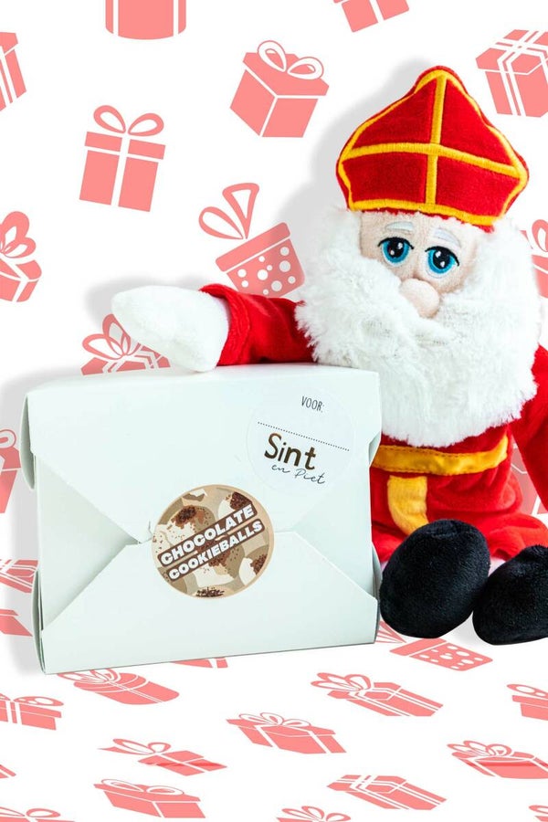 De Sint box cookieballs bestaat uit 4 Sint cookieball smaken. De verpakking is met rood inpakpapier en een Sint sticker vergelijkbaar zoals op de foto's.