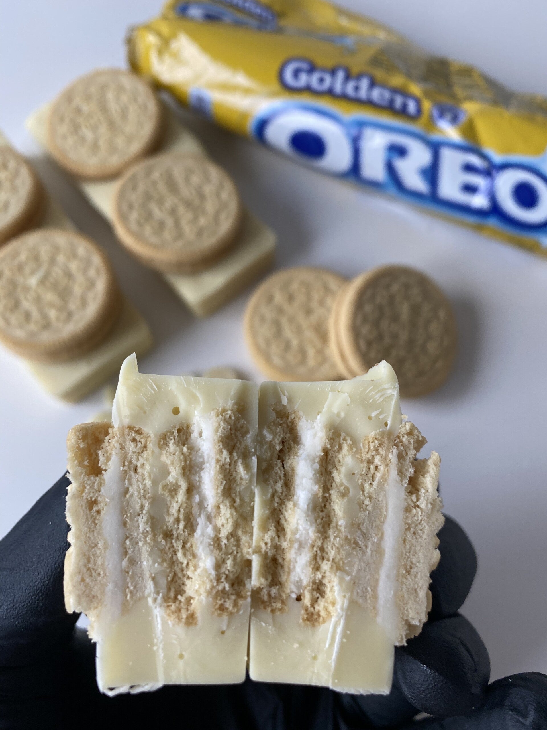 Witte chocolade van Callebaut gevuld en getopt met Golden oreo