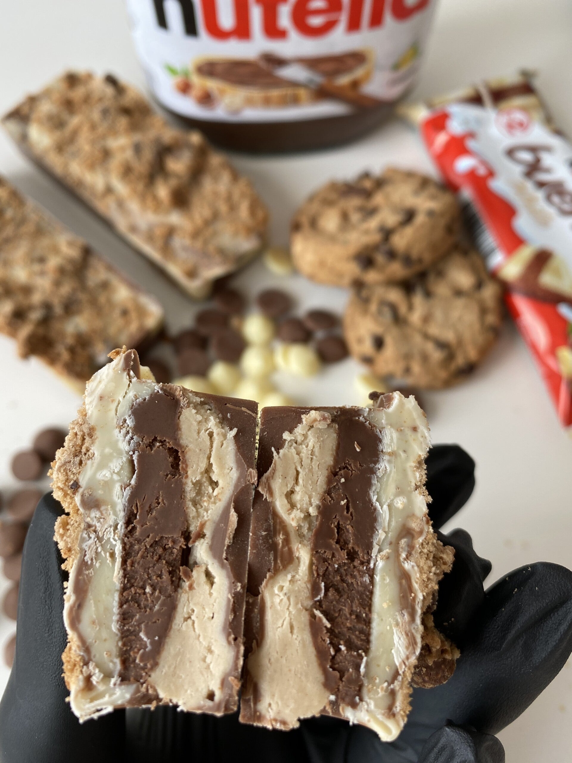 Witte en melkchocolade van Callebaut gevuld en getopt met Kinderella, Nutella en chocolate chip cookies